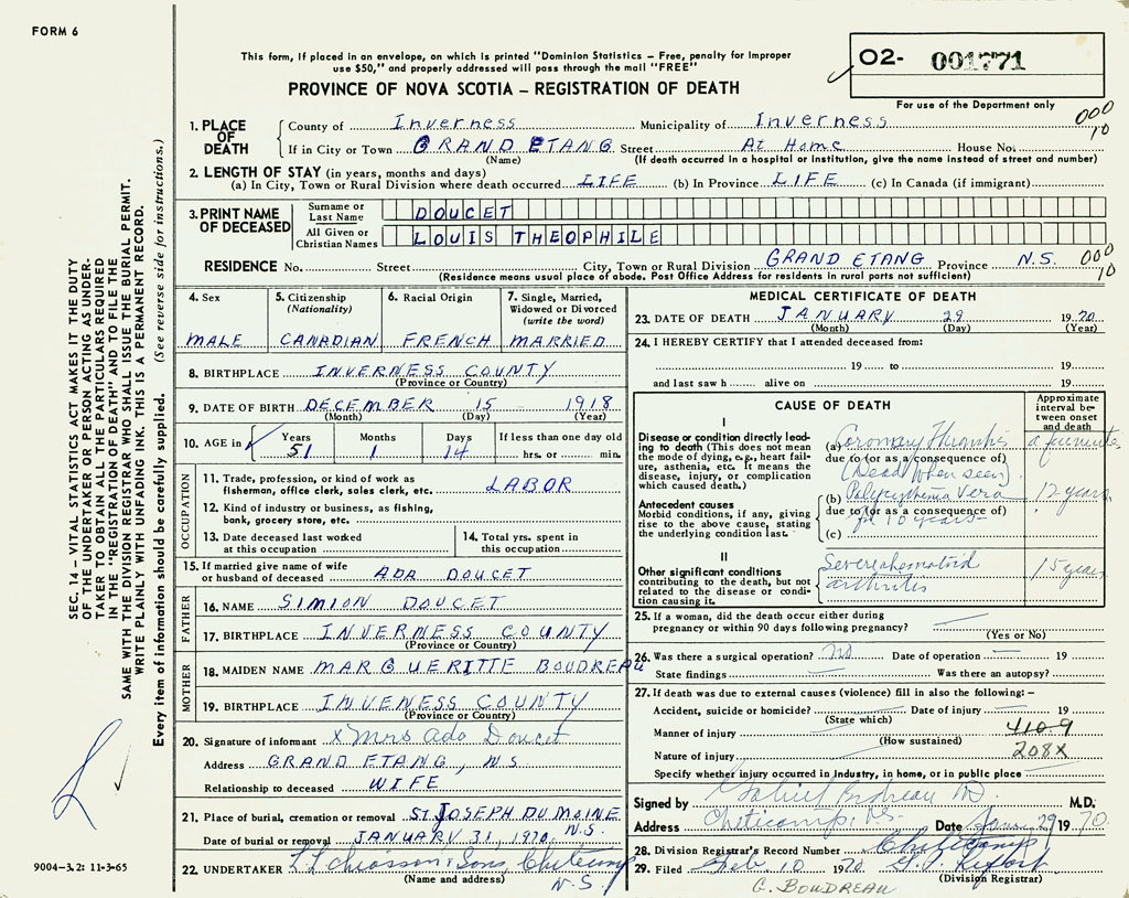 PROVINCE OF NOVA SCOTIA — REGISTRATION OF DEATH