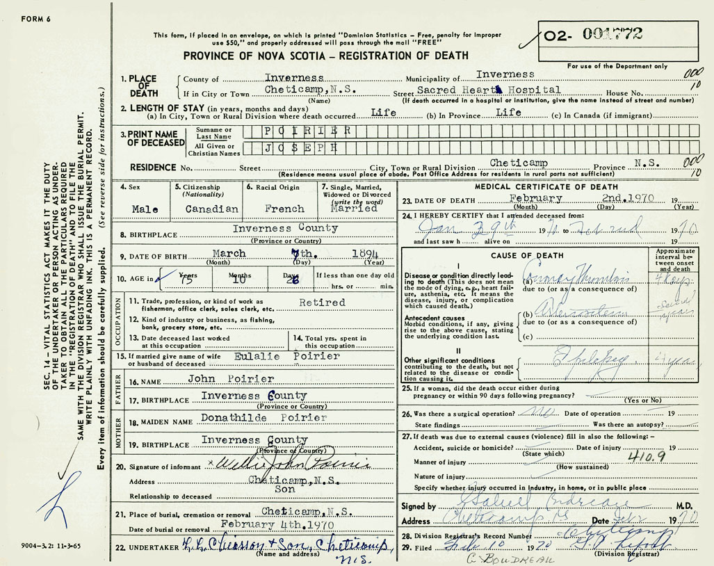 1. PLACE OF DEATH County of Inverness If in City or Town Cheticamp