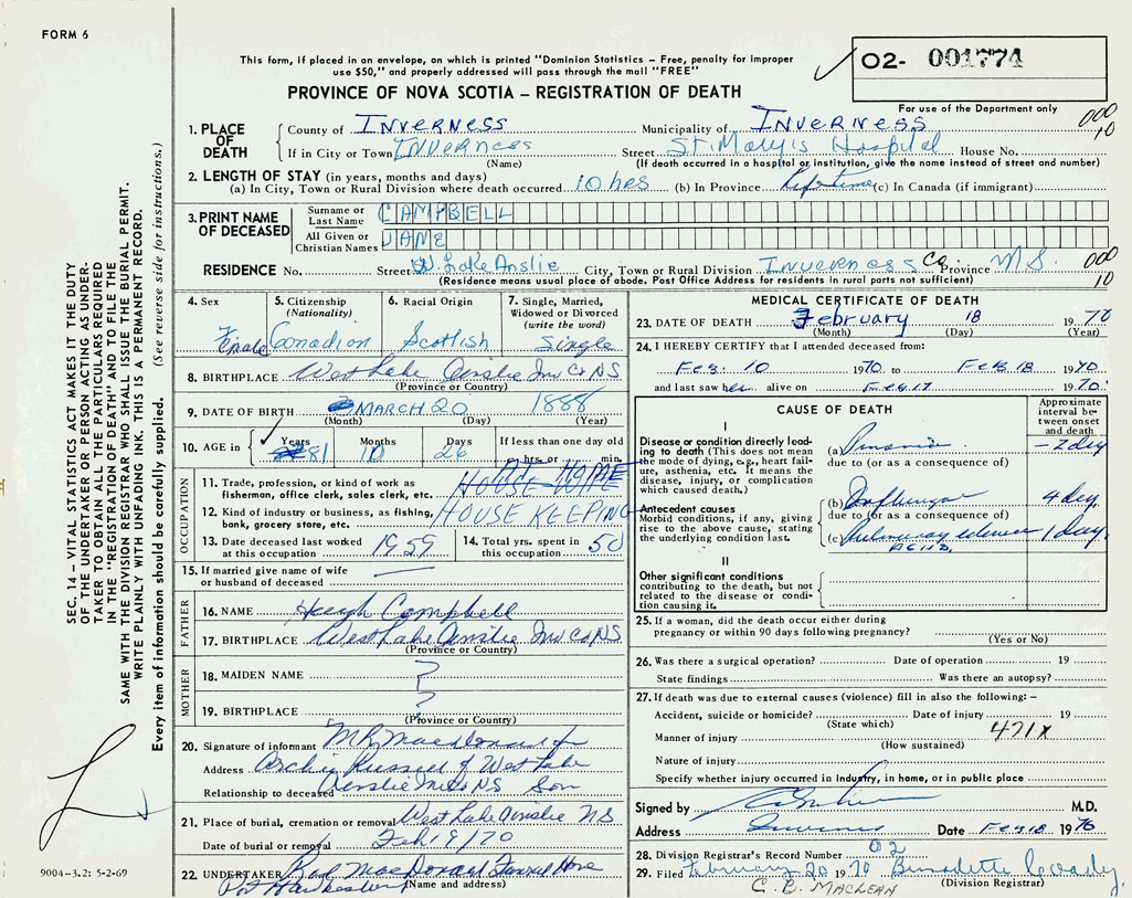 PROVINCE OF NOVA SCOTIA — REGISTRATION OF DEATH