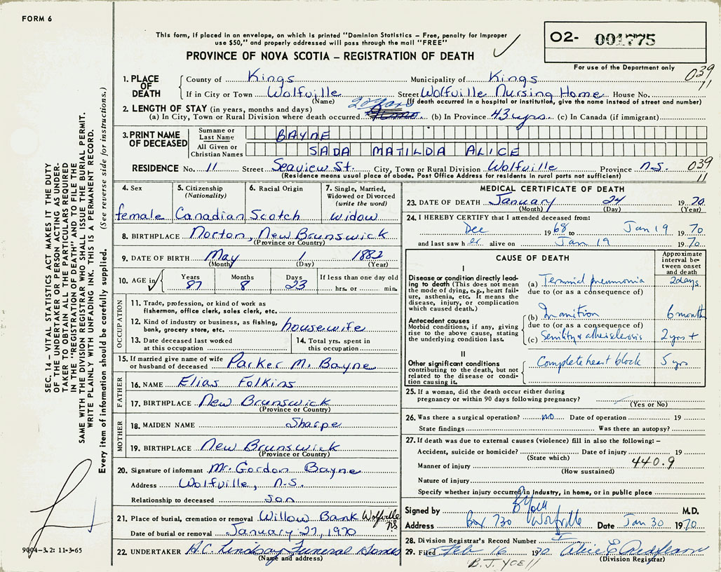 PROVINCE OF NOVA SCOTIA — REGISTRATION OF DEATH