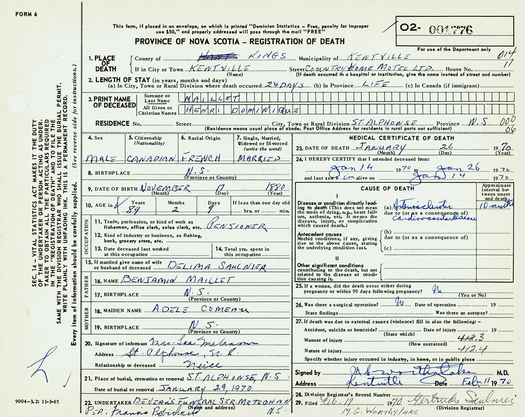 PROVINCE OF NOVA SCOTIA — REGISTRATION OF DEATH