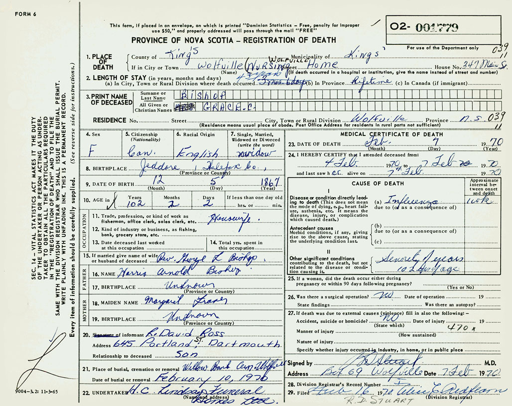 PROVINCE OF NOVA SCOTIA — REGISTRATION OF DEATH