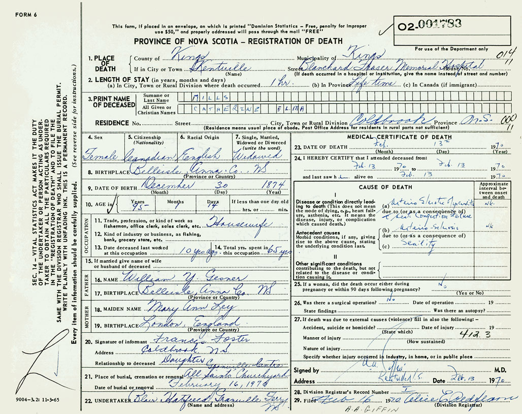 1. PLACE OF DEATH County of Kings If in City or Town Kentville
