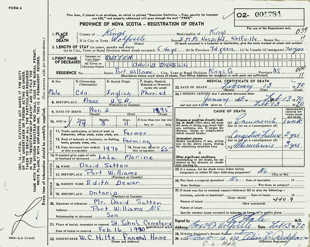 PROVINCE OF NOVA SCOTIA — REGISTRATION OF DEATH