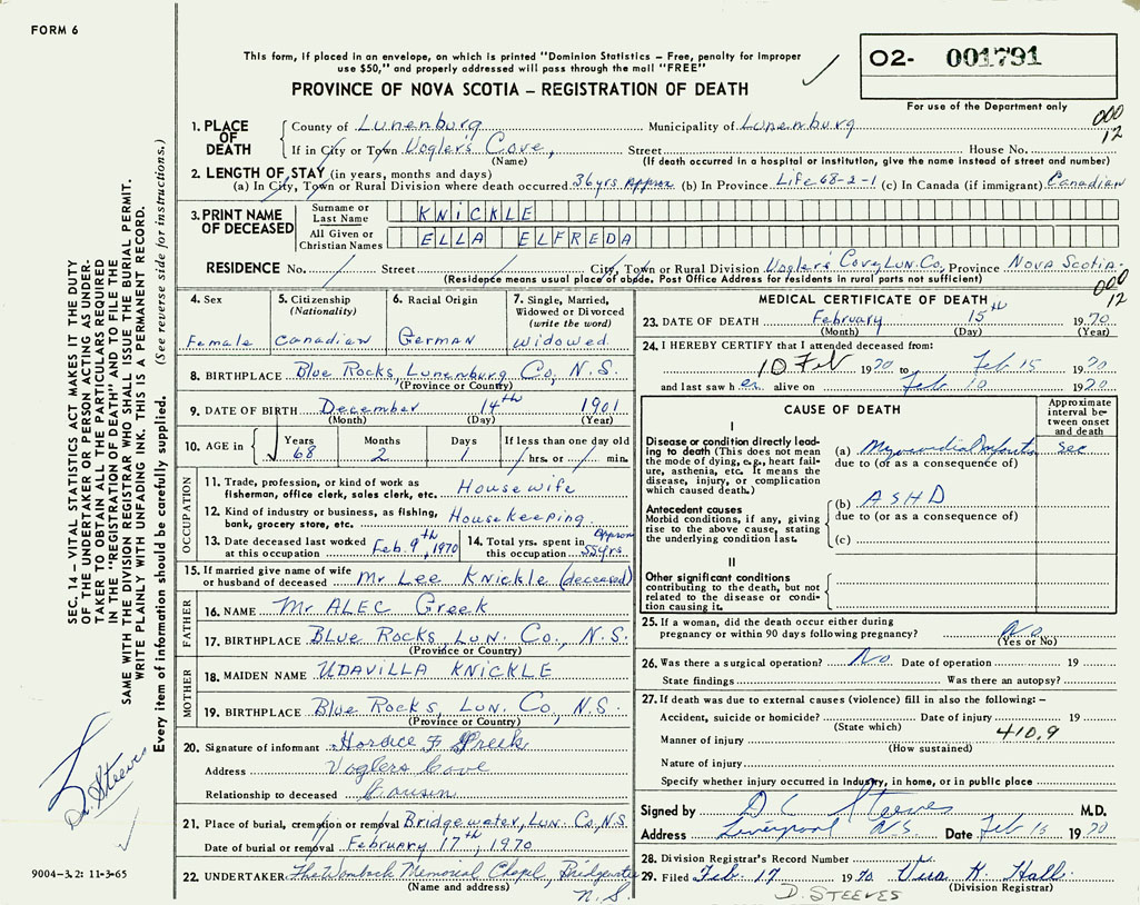 1. PLACE OF DEATH County of Lunenburg If in City or Town Voglers Cove