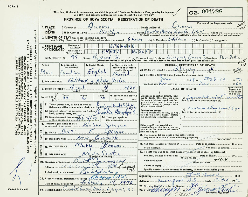 PROVINCE OF NOVA SCOTIA — REGISTRATION OF DEATH