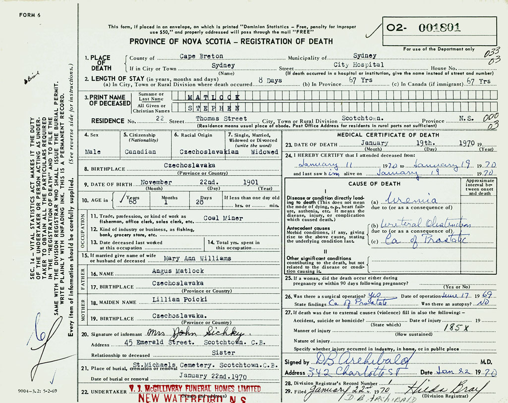 1. PLACE OF DEATH County of Cape Breton If in City or Town Sydney