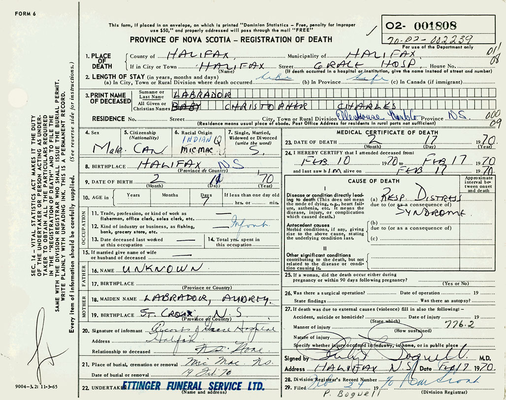 PROVINCE OF NOVA SCOTIA — REGISTRATION OF DEATH