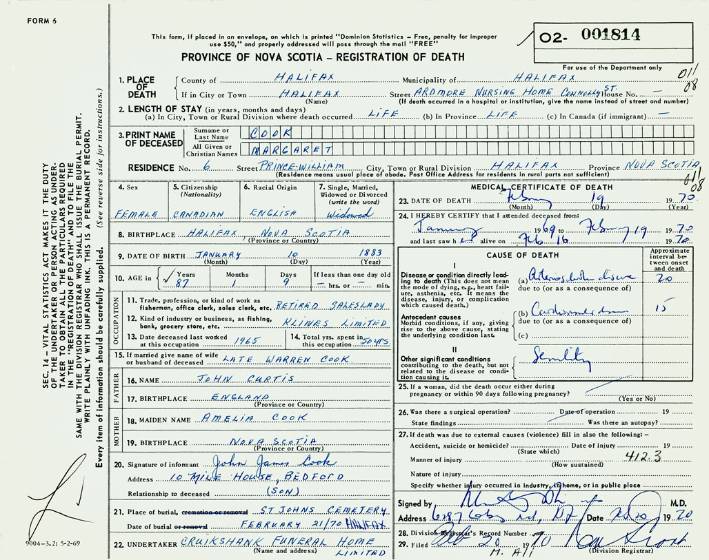 PROVINCE OF NOVA SCOTIA — REGISTRATION OF DEATH