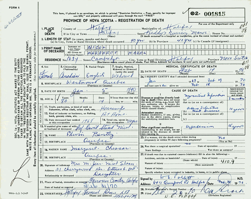 PROVINCE OF NOVA SCOTIA — REGISTRATION OF DEATH