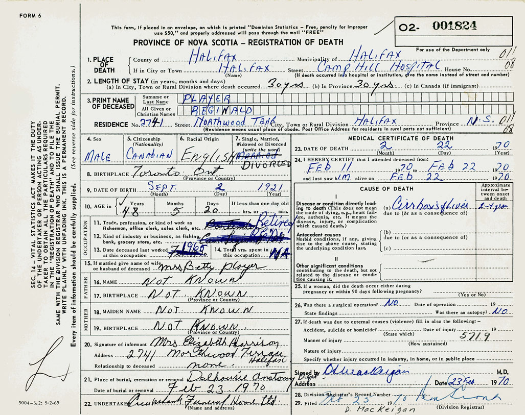 PROVINCE OF NOVA SCOTIA — REGISTRATION OF DEATH