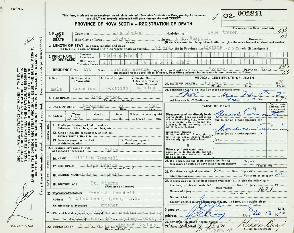 1. PLACE OF DEATH County of Cape Breton If in City or Town Sydney
