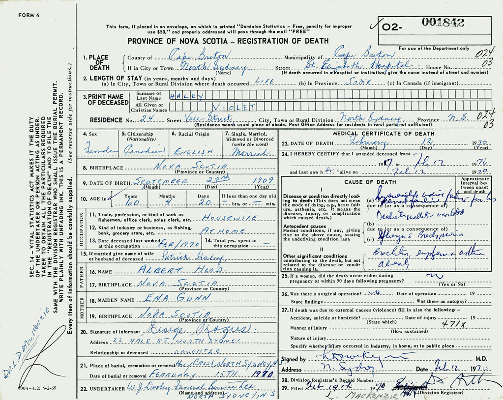 1. PLACE OF DEATH County of Cape Breton If in City or Town North Sydney