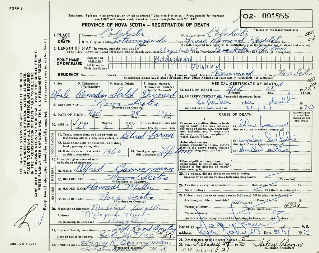PROVINCE OF NOVA SCOTIA — REGISTRATION OF DEATH