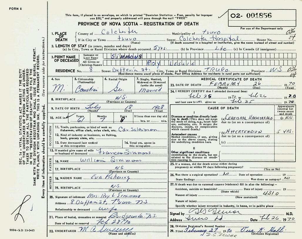PROVINCE OF NOVA SCOTIA — REGISTRATION OF DEATH