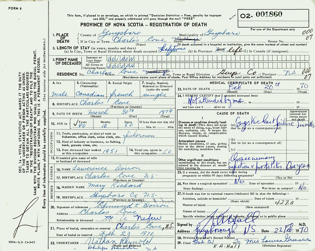 1. PLACE OF DEATH County of Guysborough If in City or Town Charles Cove