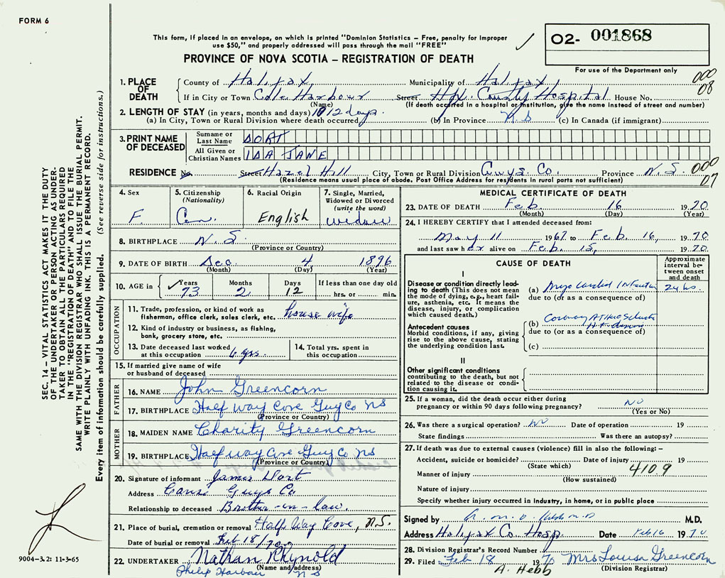 PROVINCE OF NOVA SCOTIA — REGISTRATION OF DEATH