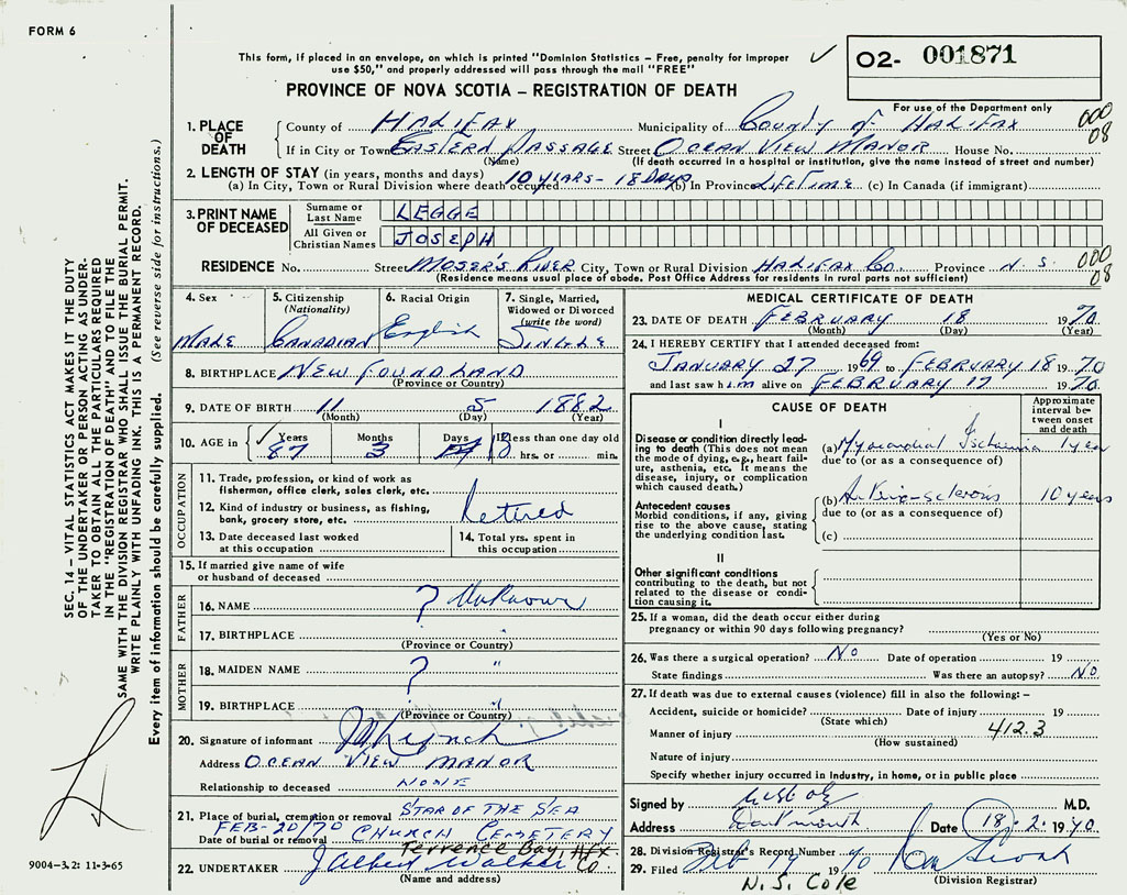 1. PLACE OF DEATH County of Halifax If in City or Town Eastern Passage