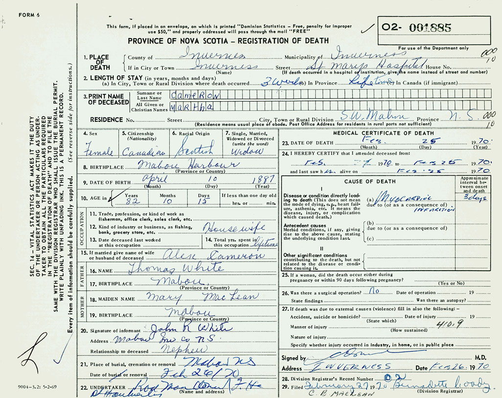 PROVINCE OF NOVA SCOTIA — REGISTRATION OF DEATH