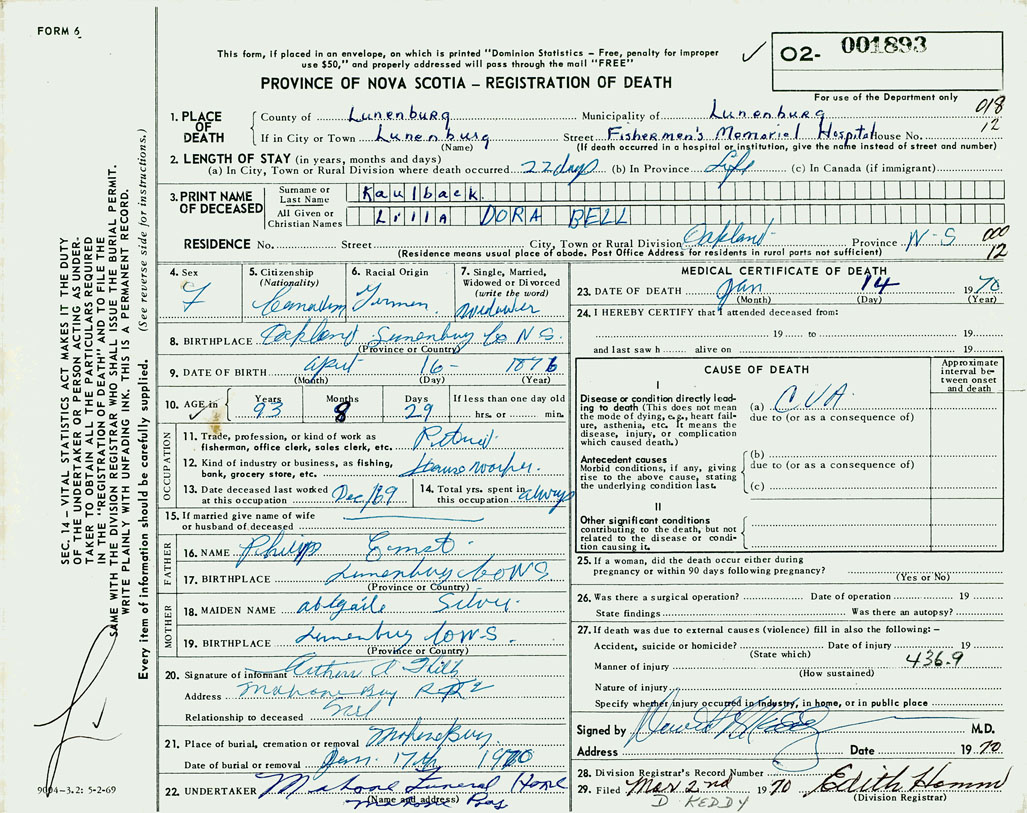 PROVINCE OF NOVA SCOTIA — REGISTRATION OF DEATH