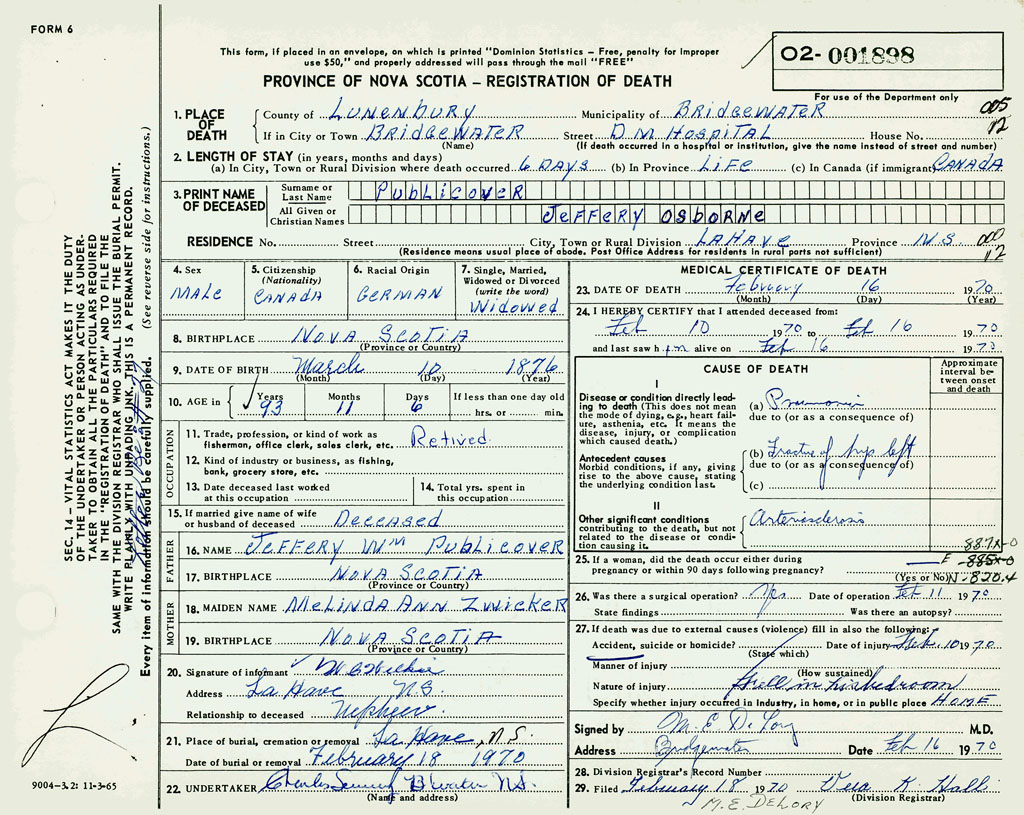 PROVINCE OF NOVA SCOTIA — REGISTRATION OF DEATH