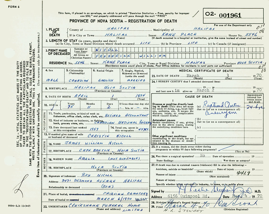 PROVINCE OF NOVA SCOTIA — REGISTRATION OF DEATH