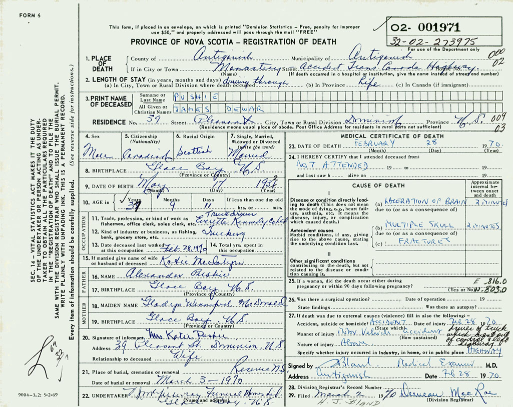 PROVINCE OF NOVA SCOTIA — REGISTRATION OF DEATH