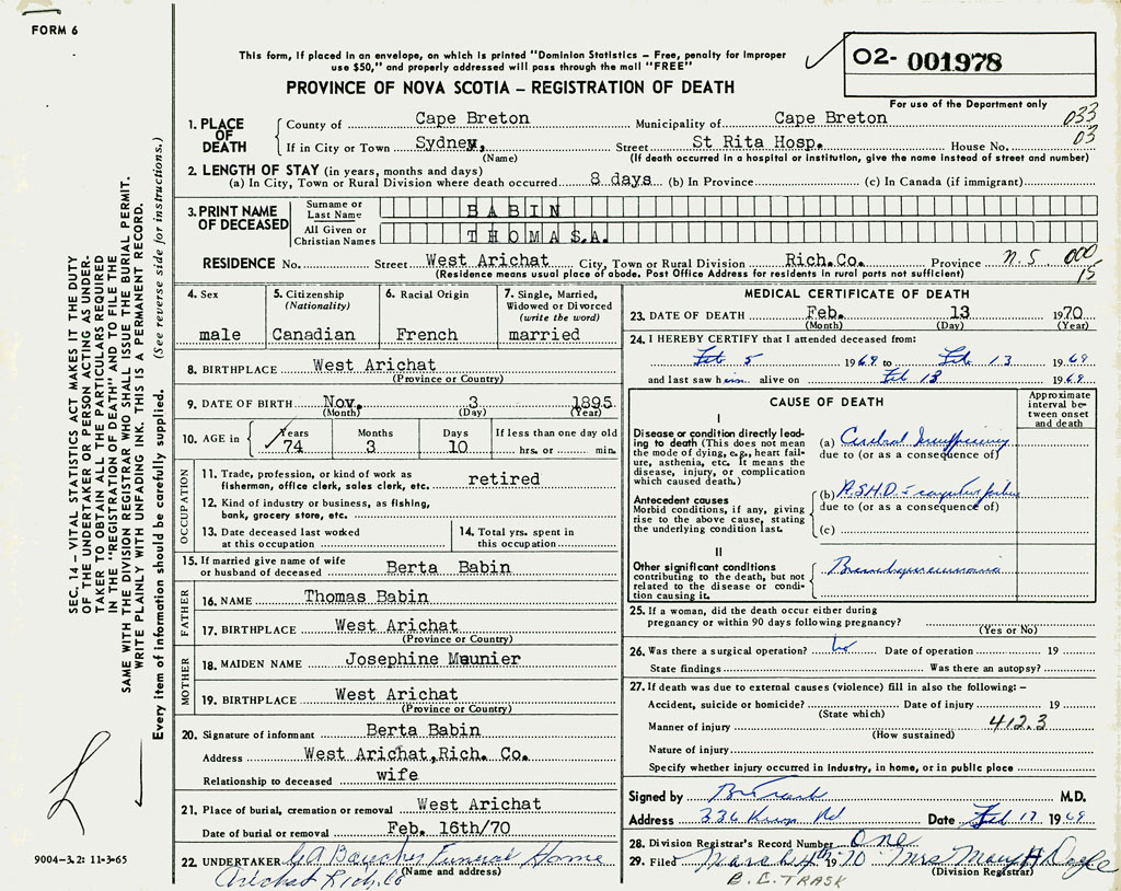 1. PLACE OF DEATH County of Cape Breton If in City or Town Sydney