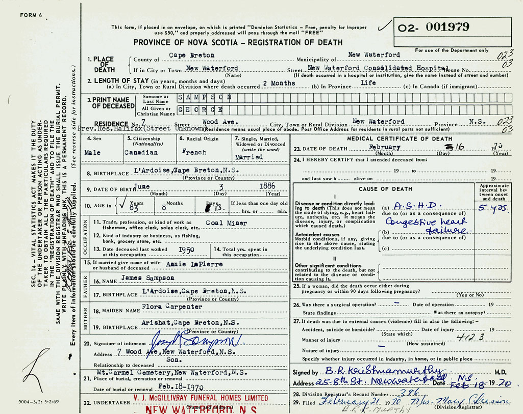 1. PLACE OF DEATH County of Cape Breton If in City or Town New Waterford