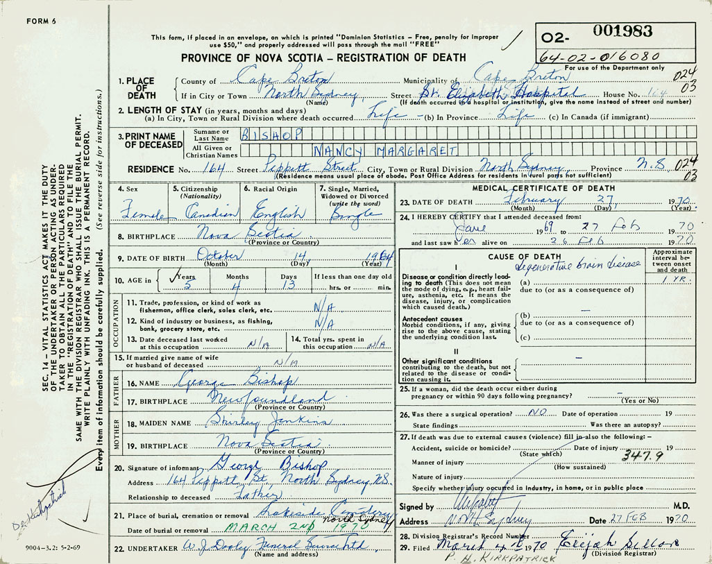 PROVINCE OF NOVA SCOTIA — REGISTRATION OF DEATH