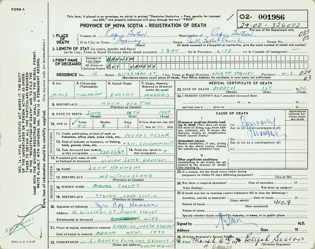 PROVINCE OF NOVA SCOTIA — REGISTRATION OF DEATH