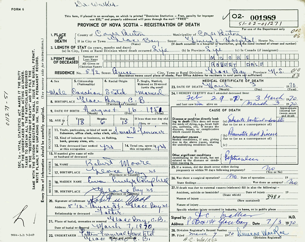 PROVINCE OF NOVA SCOTIA — REGISTRATION OF DEATH