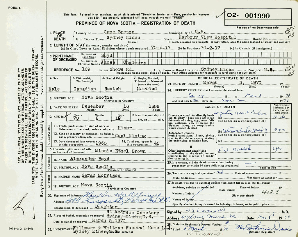 1. PLACE OF DEATH County of Cape Breton If in City or Town Sydney Mines