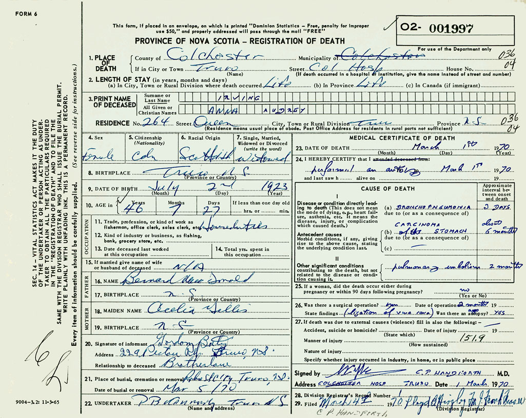 PROVINCE OF NOVA SCOTIA — REGISTRATION OF DEATH