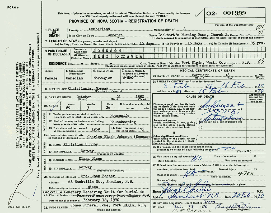 PROVINCE OF NOVA SCOTIA — REGISTRATION OF DEATH