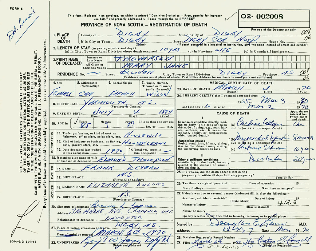 PROVINCE OF NOVA SCOTIA — REGISTRATION OF DEATH