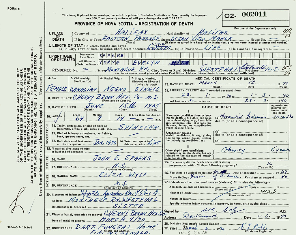 1. PLACE OF DEATH County of Halifax If in City or Town Eastern Passage