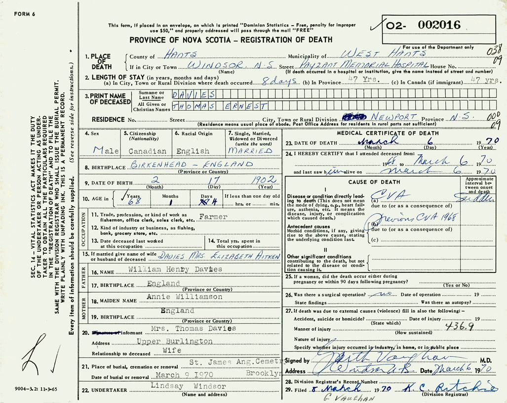PROVINCE OF NOVA SCOTIA — REGISTRATION OF DEATH