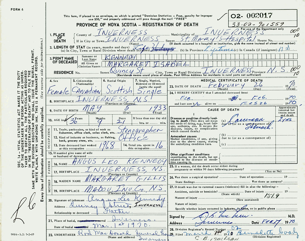 PROVINCE OF NOVA SCOTIA — REGISTRATION OF DEATH