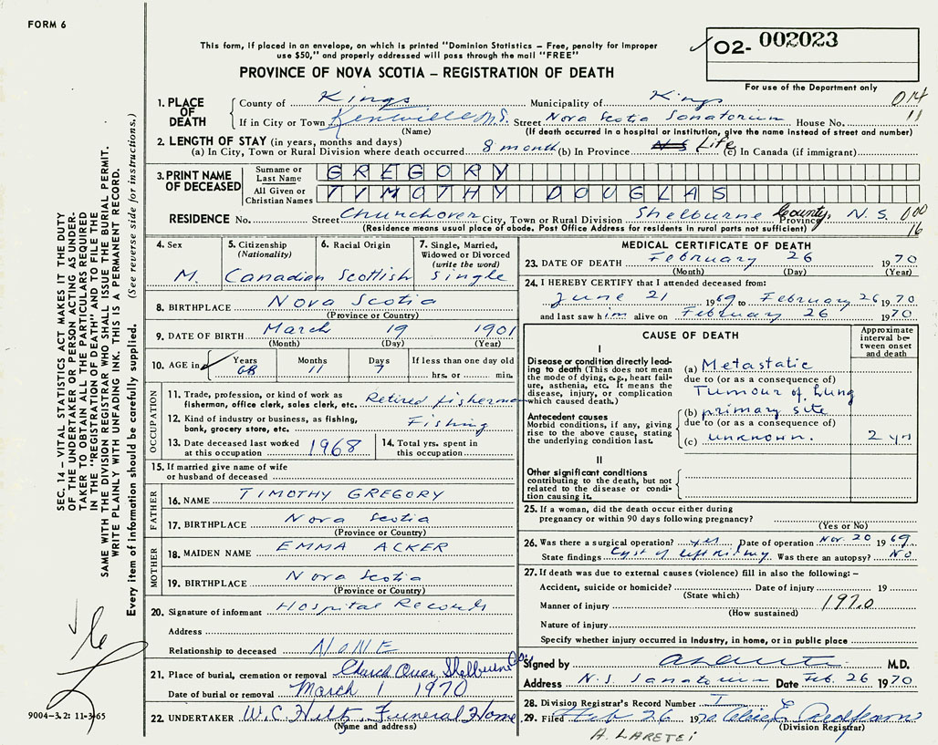 PROVINCE OF NOVA SCOTIA — REGISTRATION OF DEATH