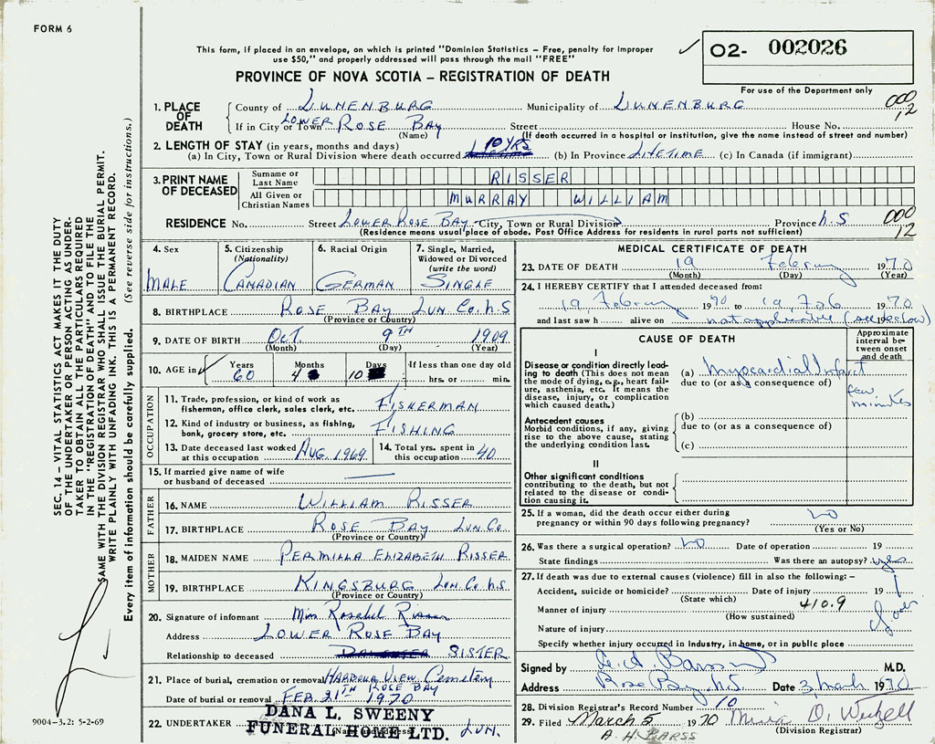 22. Undertaker Dana L. Sweeny, Funeral Home Ltd. Lunenburg County