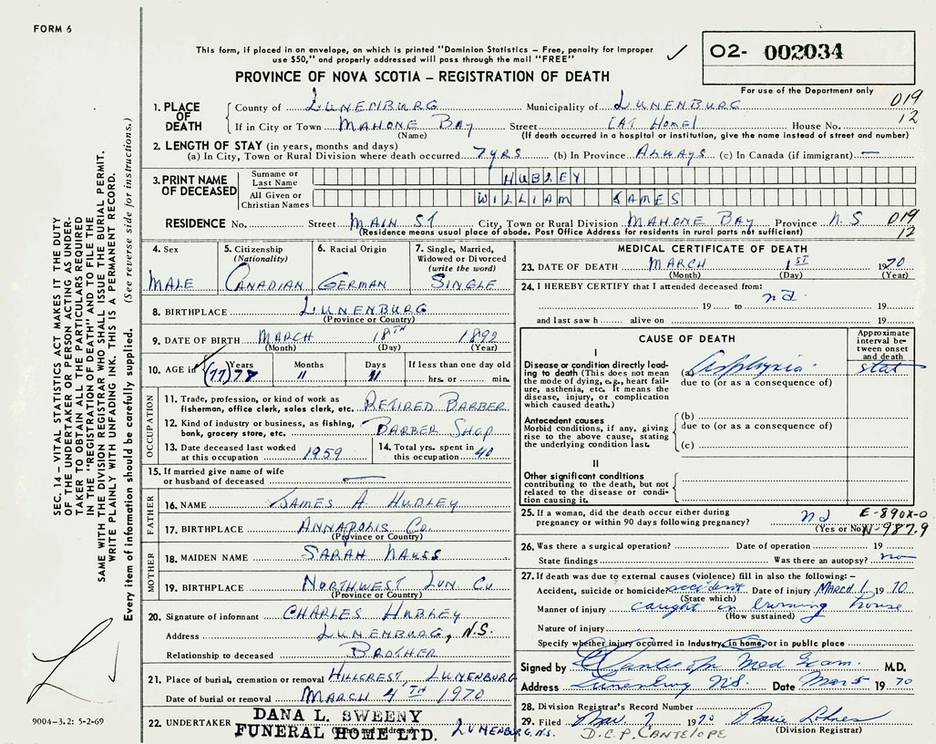 1. PLACE OF DEATH County of Lunenburg If in City or Town Mahone Bay
