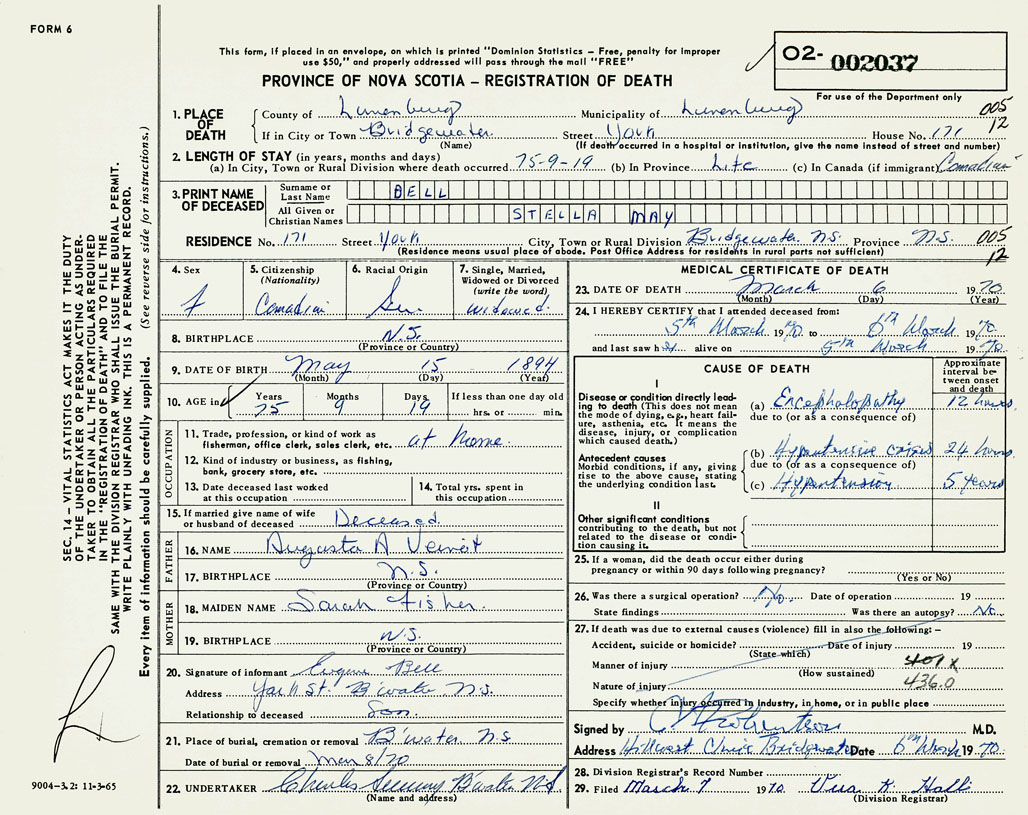 If death occured in a hospital or institution 171 York St Bridgewater, Lunenburg