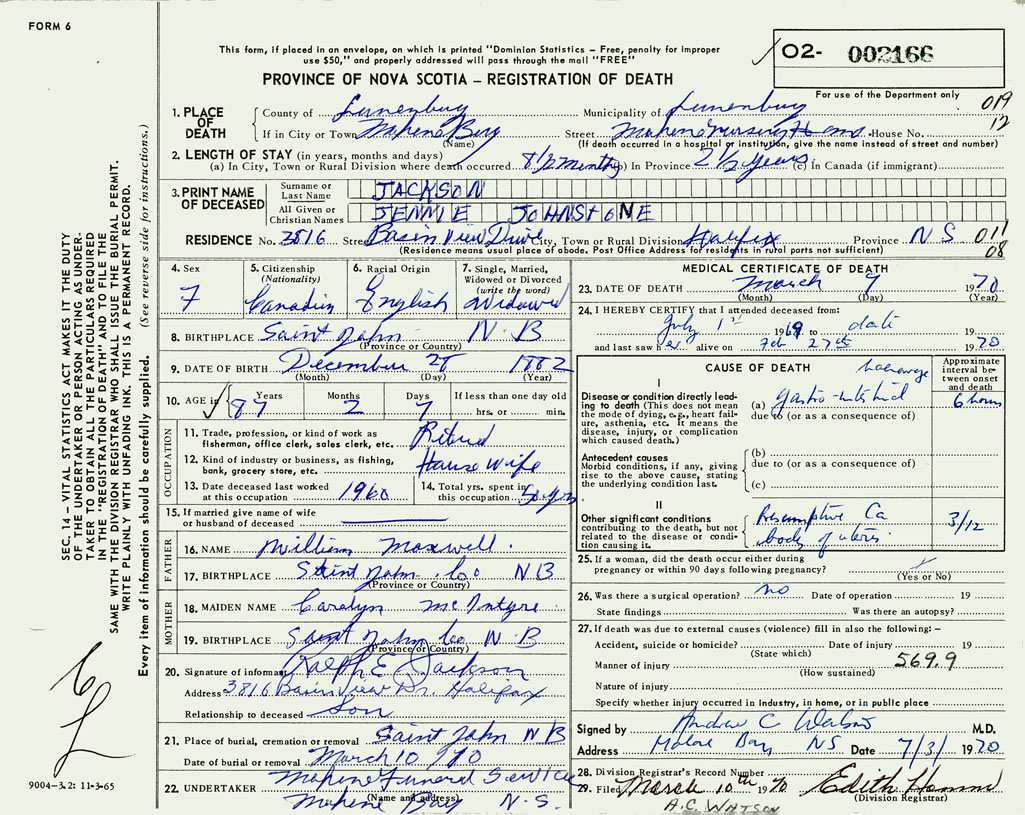 1. PLACE OF DEATH County of Lunenburg If in City or Town Mahone Bay