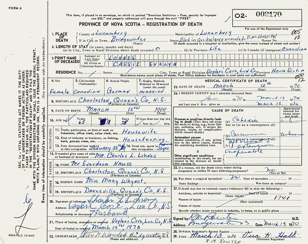 PROVINCE OF NOVA SCOTIA — REGISTRATION OF DEATH