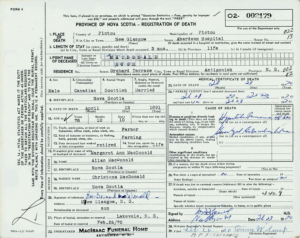 PROVINCE OF NOVA SCOTIA — REGISTRATION OF DEATH