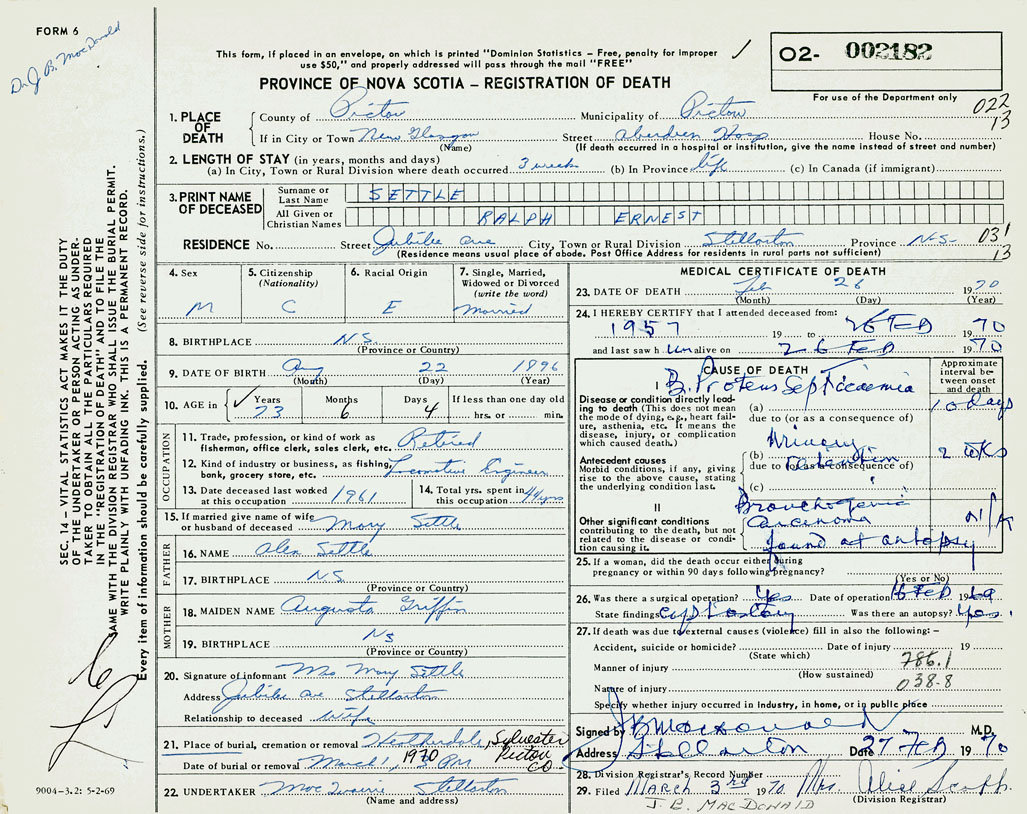 PROVINCE OF NOVA SCOTIA — REGISTRATION OF DEATH