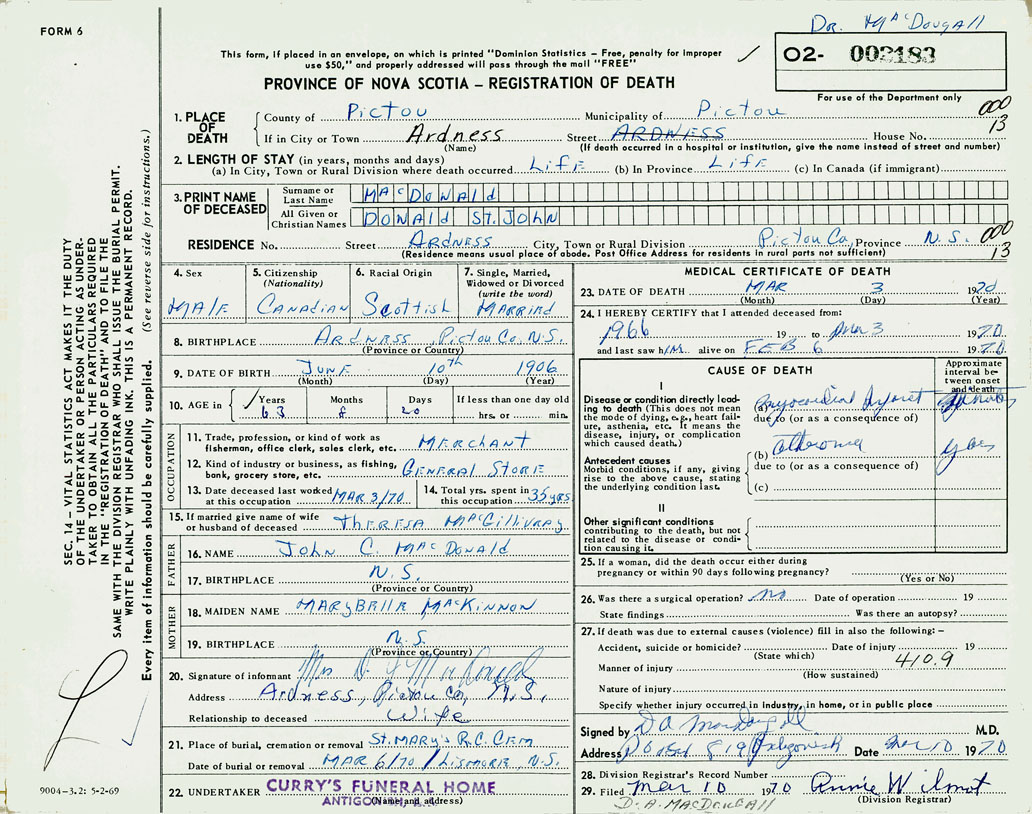 PROVINCE OF NOVA SCOTIA — REGISTRATION OF DEATH
