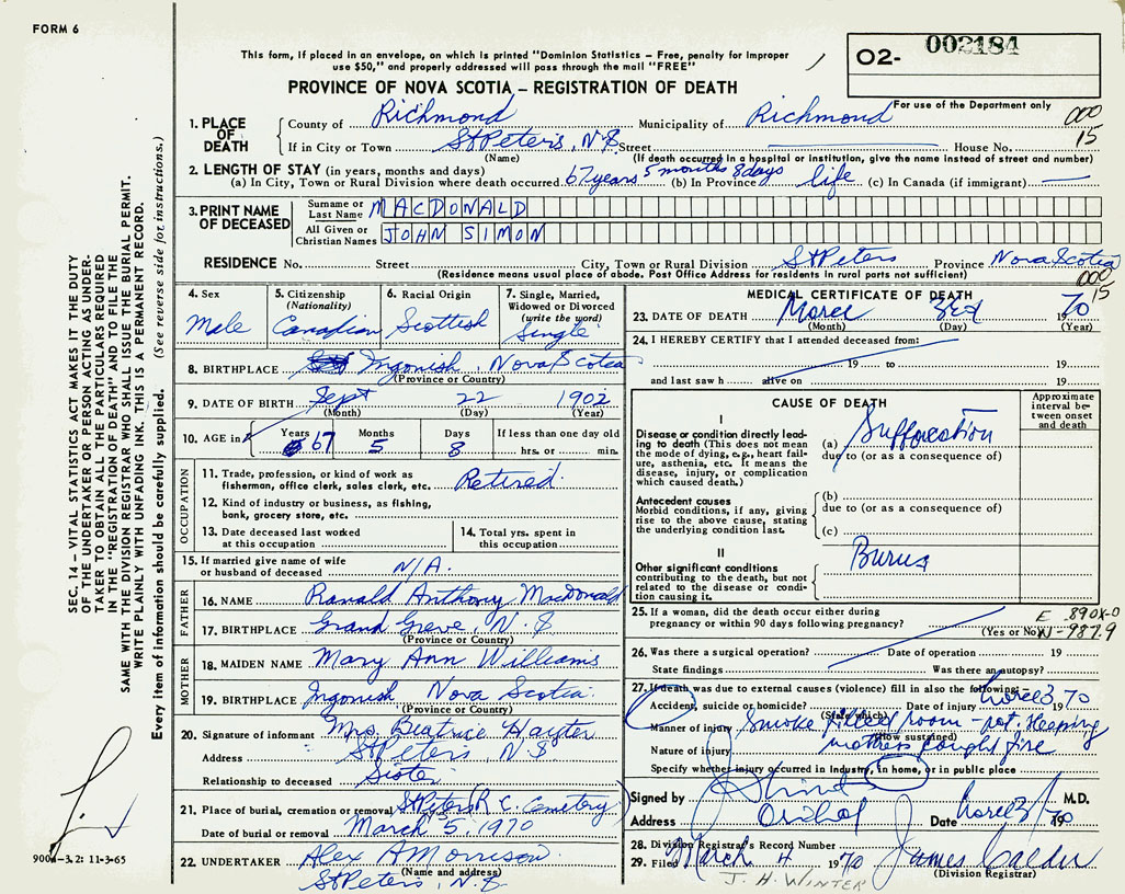 PROVINCE OF NOVA SCOTIA — REGISTRATION OF DEATH