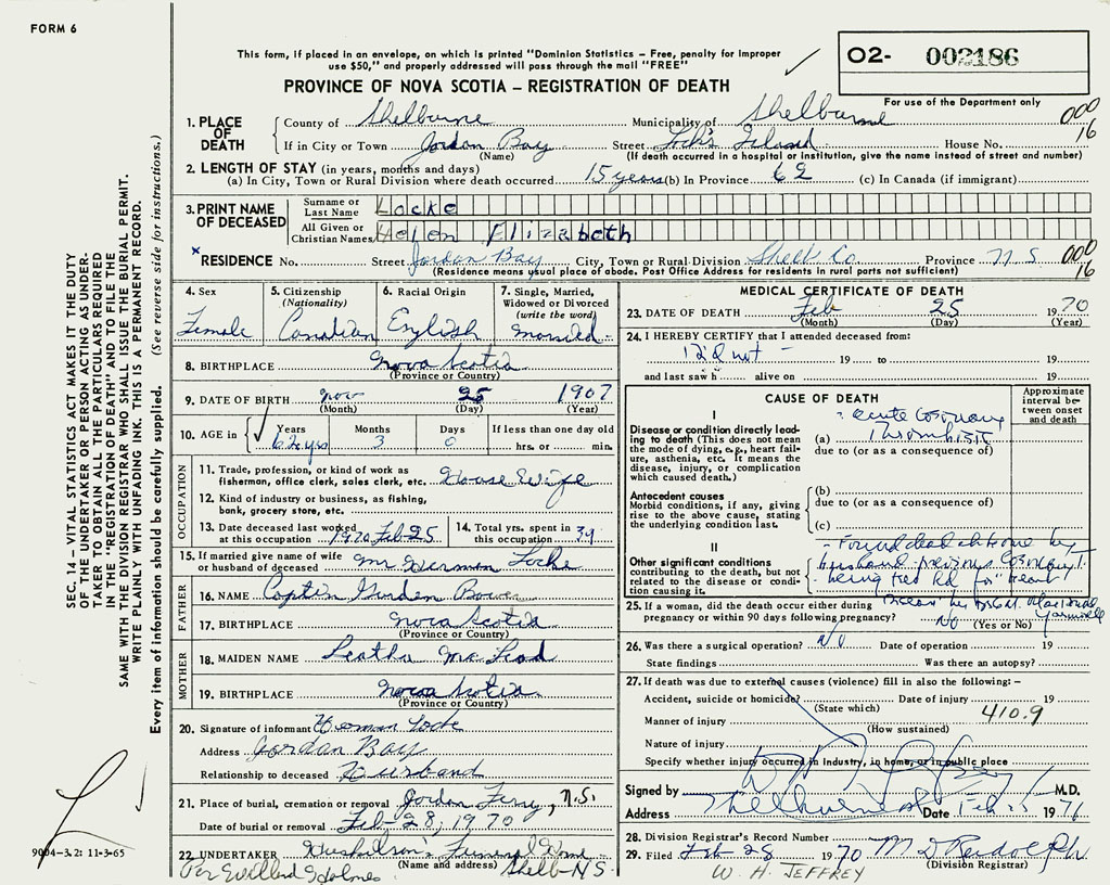 1. PLACE OF DEATH County of Shelburne If in City or Town Jordan Bay